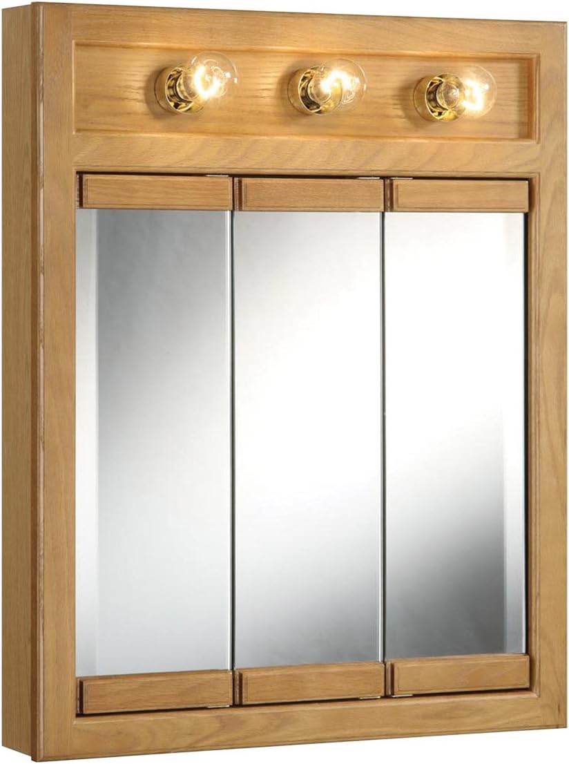 The Design House 530592 Richland Nutmeg Oak Lighted Tri-View Wall Cabinet Mirror features a nutmeg oak finish with a water resistant seal. This product has a rustic shabby chic design, meshing modern construction with vintage aesthetics. With a solid wood frame and 3-door design, this medicine cabinet measures 24-inches long by 30-inches wide and features three vanity lights to brighten up your entire bathroom. With a country living motif, this medicine cabinet graces your home with its bright finish and clean lines. The cabinet doors glide open revealing shelves to store shampoo, medicine and makeup. This mirror will not chip or stain in steamy bathrooms. Use this mirror for shaving or applying makeup in the morning. The cabinet is CARB compliant and is UL listed and approved for damp areas. The Design House 530592 Richland Nutmeg Oak Lighted Tri-View Wall Cabinet Mirror has a 1-year limited warranty that protects against defects in materials and workmanship.