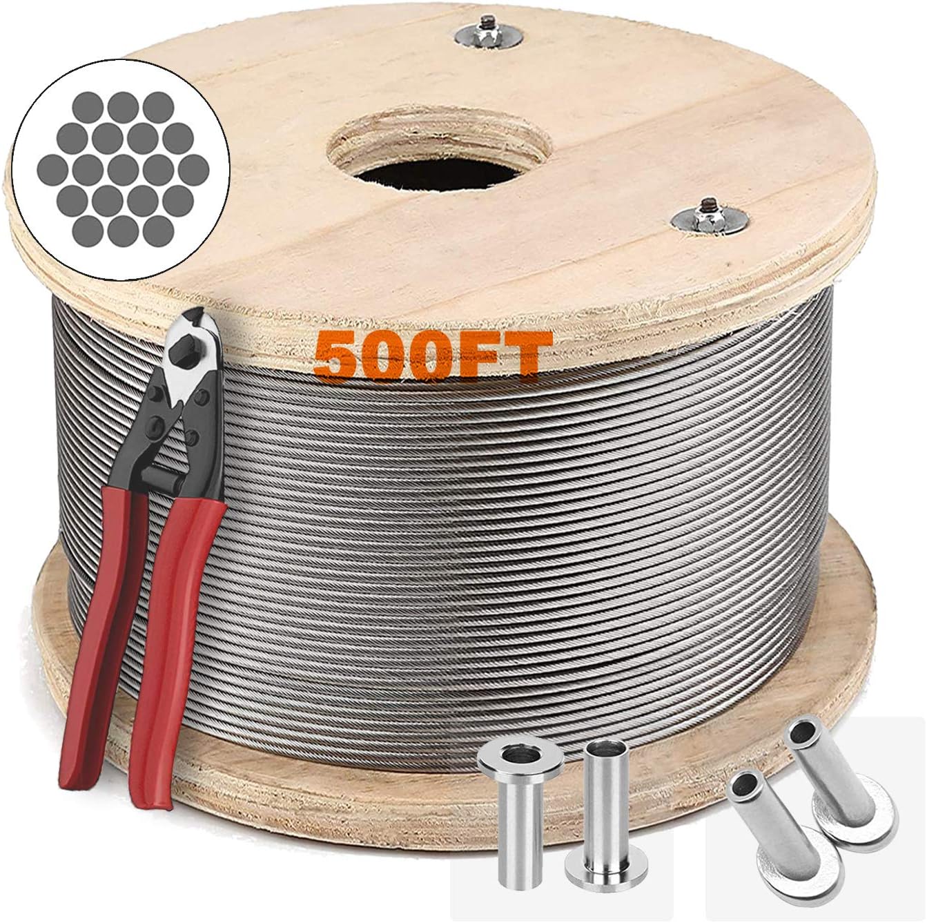 Wayska 1/8 Inch Stainless Steel Cable 500FT, Aircraft Cable T316 Marine Grade, Wire Rope with Cable Cutter and 60 Pack Stainless Steel Protector Sleeves for Cable Railing, 1x19 Strands Construction
